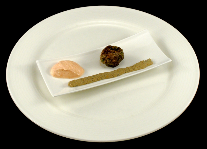 - Neem de kleine rechte bordjes. Leg in het midden een gehaktballetje.