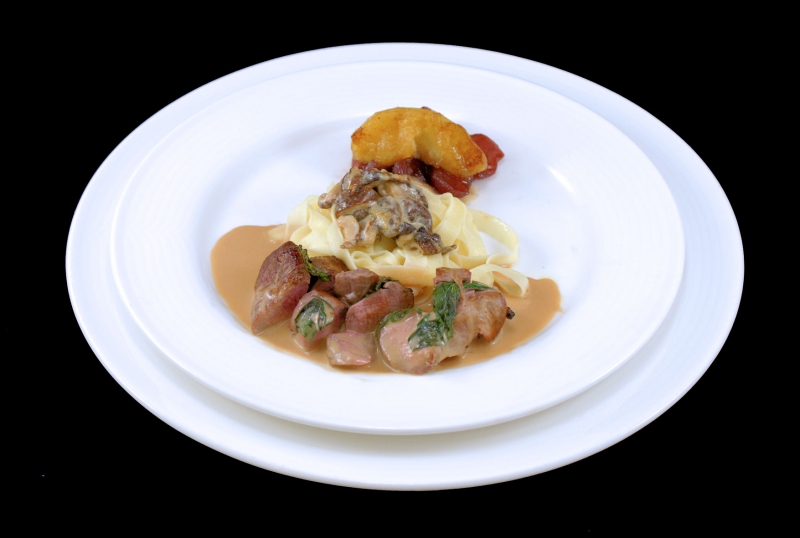 - Hiernaast een spiegeltje saus. Snijd de lamshaasjes in plakjes; leg de lamshaasplakjes op het spiegeltje saus (1/2 lamshaasje per persoon)