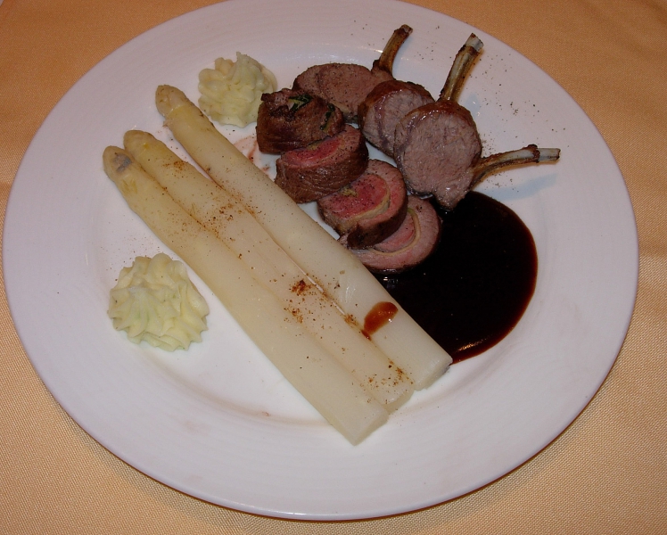 Lamsrack en lamsfilet met een sjalottenpepersaus en asperges