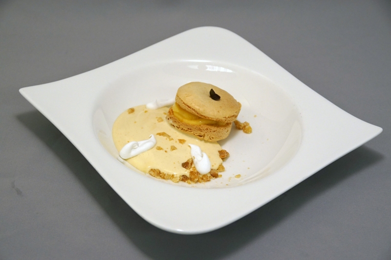 - Leg een bol amandel-citroenijs op een bordje en zet er een macaron tegenaan en garneer met de meringuestaafjes en blauwe bessen.