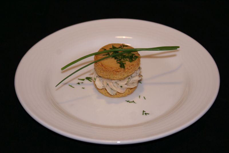 - Vulling. Snipper 50 g gerookte zalm in heel kleine stukjes (tartaar) en zet apart.