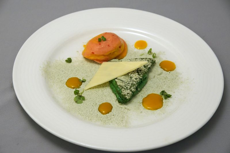 - Leg er een quenelle van het mango-aardbeienijs naast en druppel er wat mangocoulis omheen.