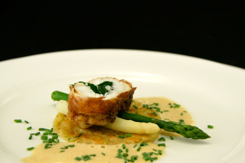 - Garnituur: Kook de witte en groene aspergepunten apart beetgaar in gezouten water.