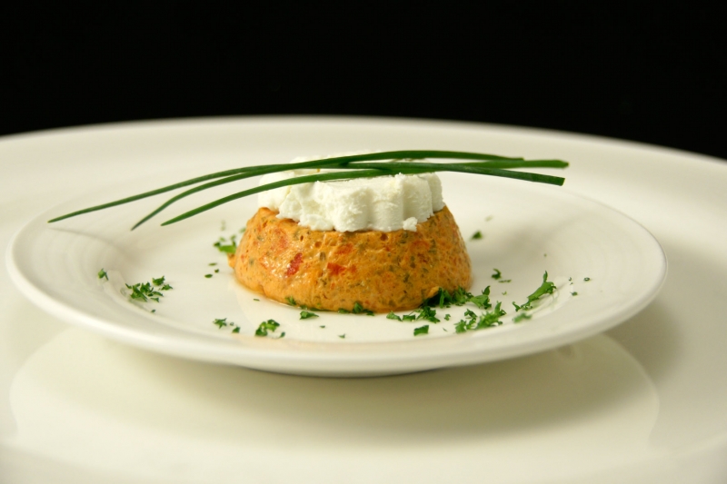 - Leg een rondje verse geitenkaas op de paprikamousse en bestrooi deze met zeezout en het restant van het komijnzaad.
