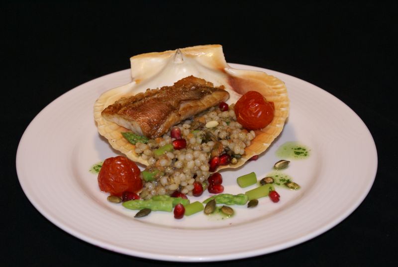 - Snijd de mulfilet doormidden en leg de 2 stukjes kruislings over de couscous.