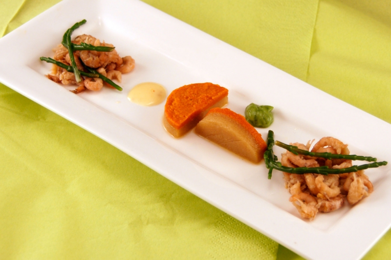 - Zeekraalemulsie: Alle ingrediënten moeten op kamertemperatuur zijn. Maak de zeekraal schoon en haal de harde stukjes er uit. Pureer de zeekraal tot een glad mengsel. Maak mayonaise van de sushiazijn, citroensap, eierdooier en de maïsolie. Meng zoveel van de mayonaise door de gepureerde zeekraal tot er een zeekraalemulsie ontstaat en breng op smaak met peper en zout.