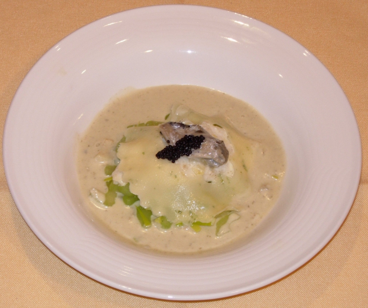 - Schep de prei op de borden. Leg hierop de griet en daarop een plak pasta. Verdeel de champignons rond de vis en leg er de selderijreepjes op. Leg de lauwe oesters in het gat van de pasta en schep hierop de kaviaar.