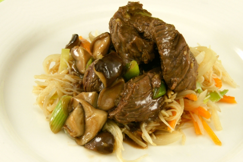 - Voeg het vlees weer toe en verwarm kort met de oestersaus en breng op smaak met sesamolie.