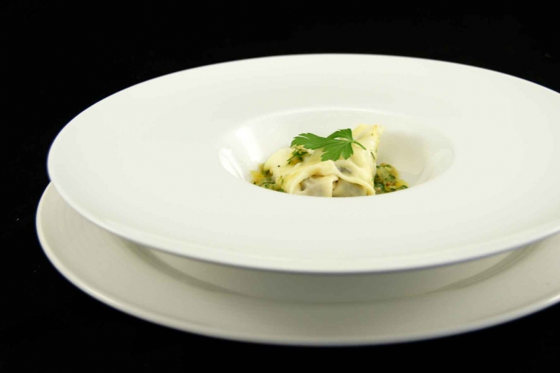 - Plaats de tortellino in het midden hiervan op het bord.