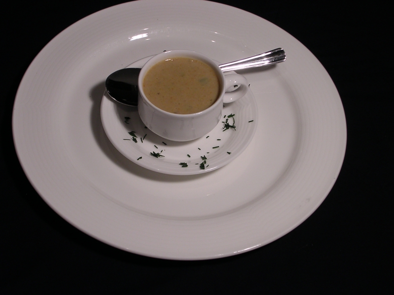 - Verdeel de stukjes paling over de warme soepkoppen, schep hier de soep over en serveer uit.