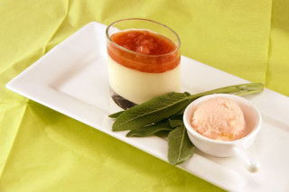 - Zet een glaasje met panna cotta op een bordje en schep er wat rabarber op.