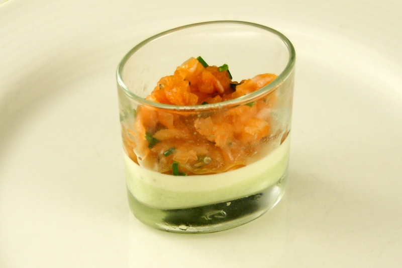 - Serveer de pannacotta met zalmtartaar in ovale amuseglaasjes op kamertemperatuur.