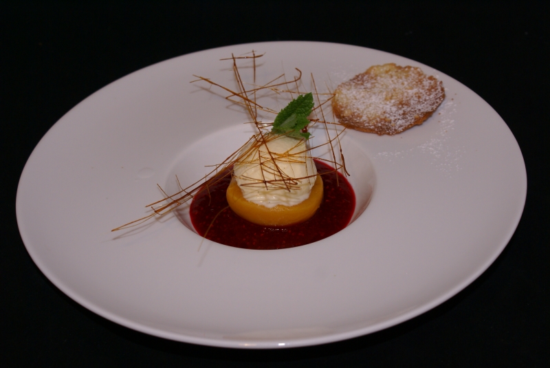 - Maak een spiegeltje van de frambozensaus op het bolbord.