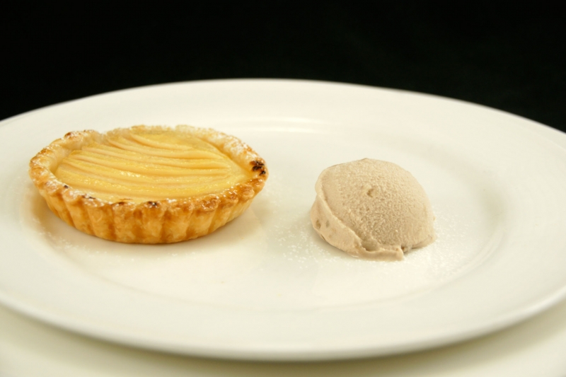 - Leg op het midden van elk taartje een peer en duw de plakjes voorzichtig een beetje uit elkaar zodat deze een waaiertje vormt.