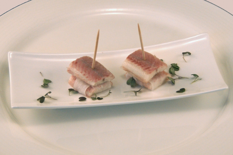 - Leg in het midden van het kruisje 2 plakjes paling op elkaar en vouw de uiteinden van de rettich over de paling heen, je pakt als het ware de paling in met de rettich.