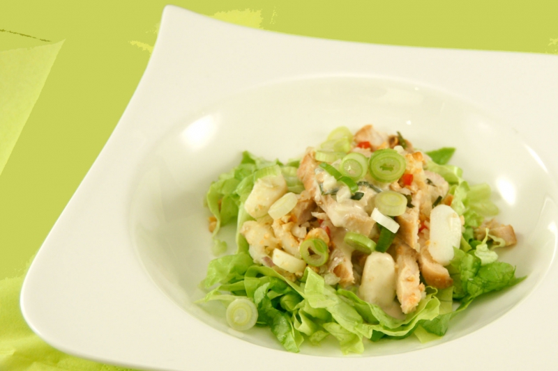 - Leg hierop het kipmengsel en dresseer dit met de kokosdressing.