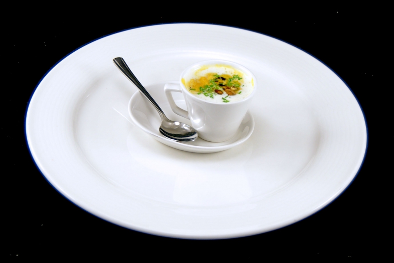 - Neem de amusesoepkopjes en doe in ieder kopje een kleine theelepel lobbig geslagen room.