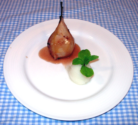 - Zet de peer op een amandelcakeje op het bord en schep er een beetje saus overheen. Voeg een bolletje sorbet toe en garneer met een blaadje munt.