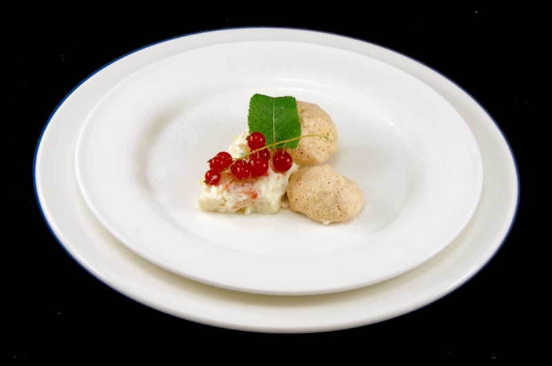 - Garneer met een muntblaadje, een half takje rode bessen en 2 koekjes.