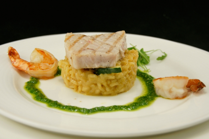 - Vlak voor uitserveren: Grill de zwaardvis in een grillpan en breng op smaak met peper en zout.