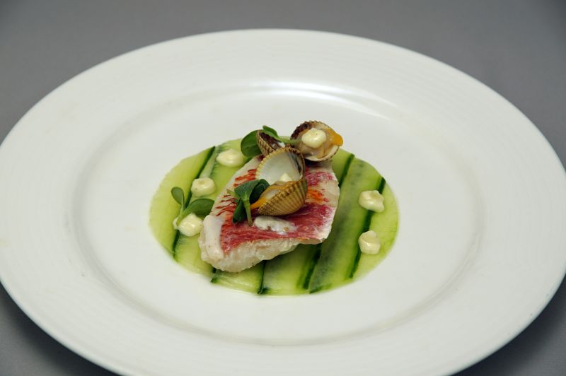 - Leg op iedere komkommercirkel een rode mulfilet met de huid naar boven.