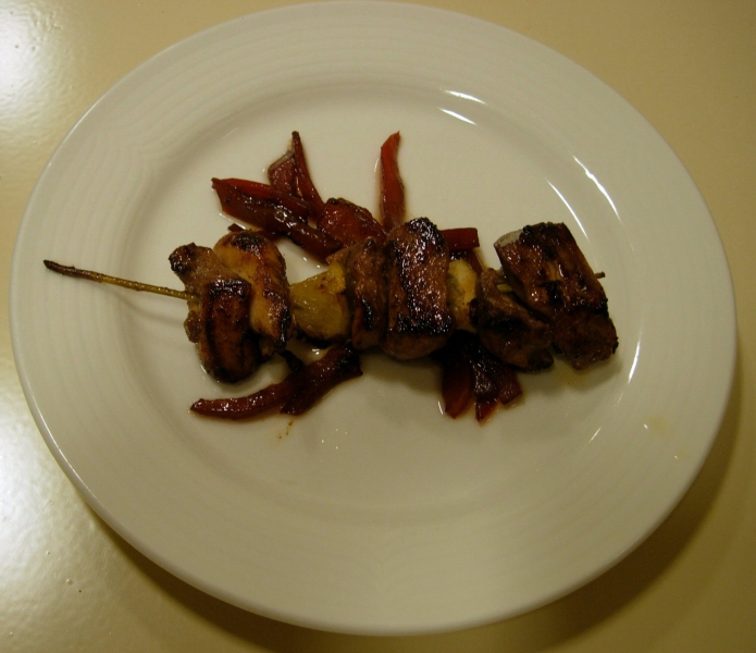 - Leg wat reepjes paprika op het bord en leg een saté er op. Druppel er wat deglaceer vocht over.