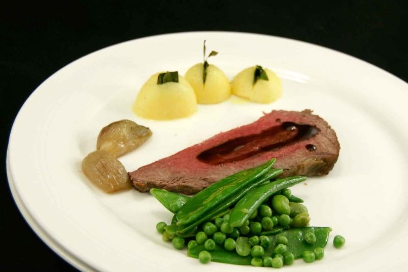Runderstaartstuk met gepofte sjalotten, tijmjus, laurieraardappeltjes en geroerbakte zomergroenten