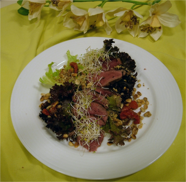 - De springbokfilet dun trancheren en lauwwarm rond de sla leggen