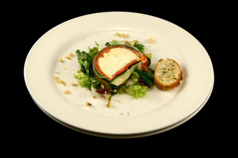 - Bekleed de vorm eerst met courgette en dan daarop een laagje van de rode paprika. Leg de repen in de breedte zodat aan de zijkanten wat overhangt. Vul de vorm met de geitenkaas en dek dan weer af met paprika- en dan courgetteplakken die aan de zijkant overhangen.
