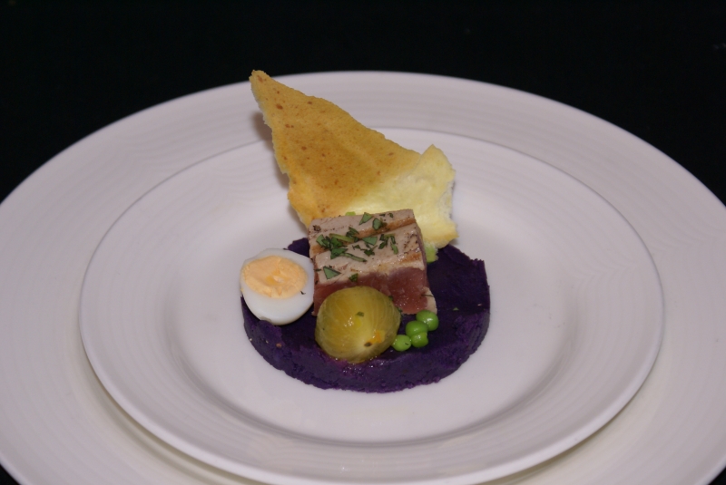 - Leg in het midden van de crème een blokje gegrilde tonijn.