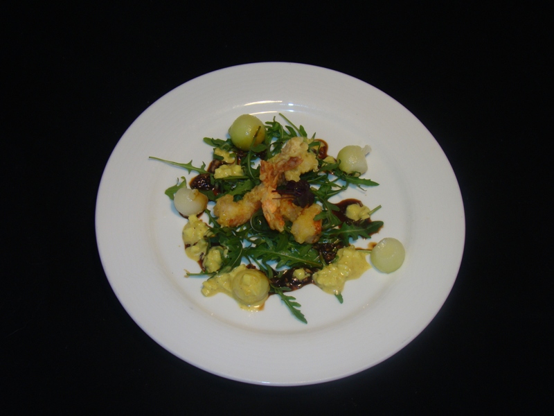 - Vlak voor uitserveren: Haal de gamba's door het tempurabeslag en frituur ze op 180ºC goudbruin.
