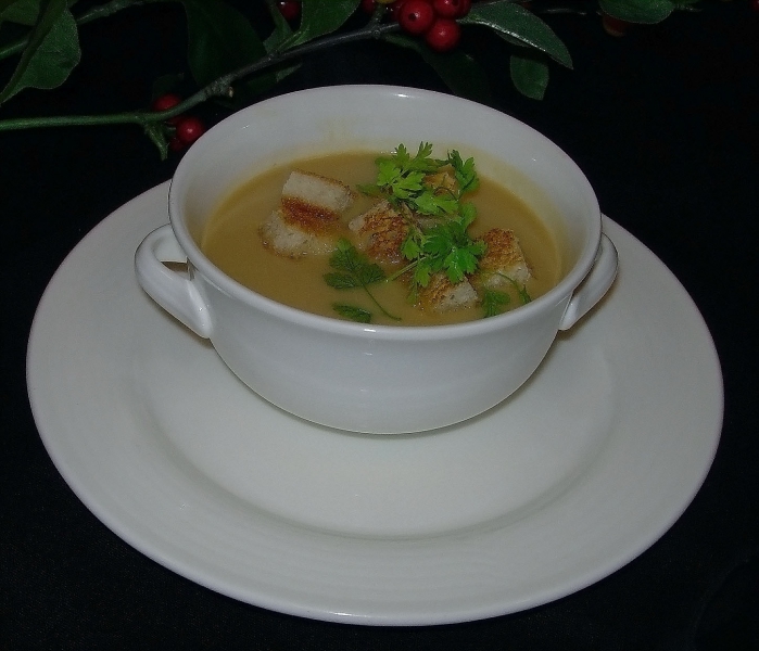 - De soep in warme soepkoppen schenken en garneren met kervelpluksel en broodcroutons.