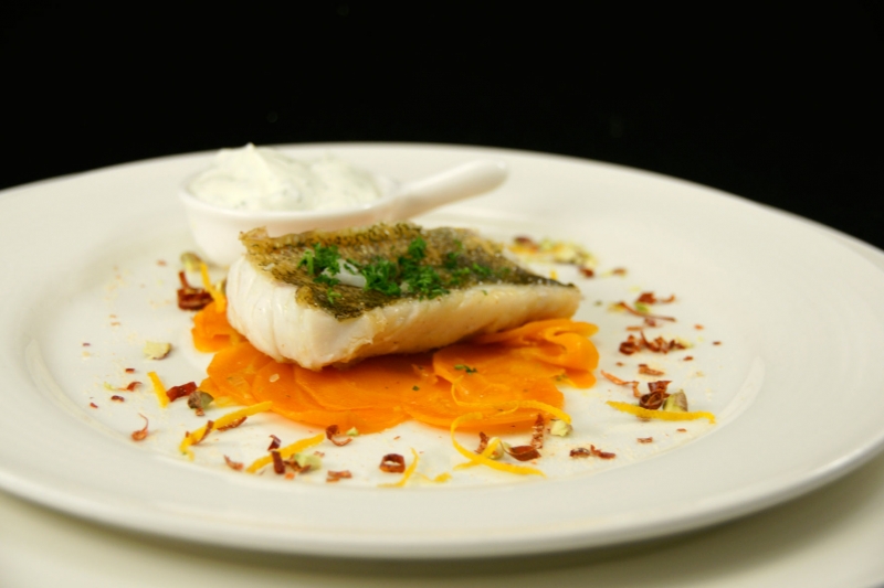 - Strooi de pistachenootjes en de zestes van de sinaasappel rondom de vis.
