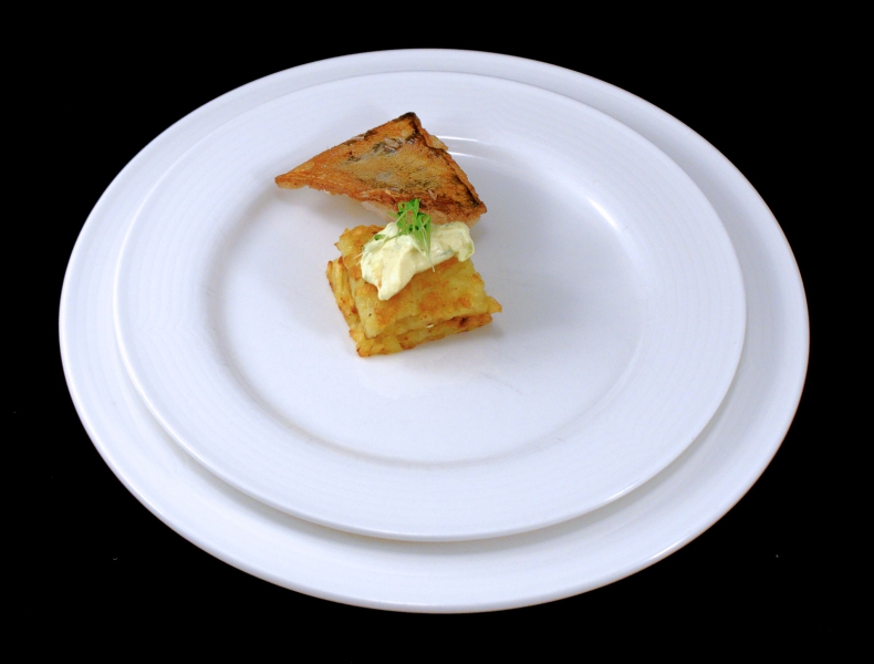 - Snijd hier uit 28 rechthoekige aardappelkoekjes. Houd ze warm