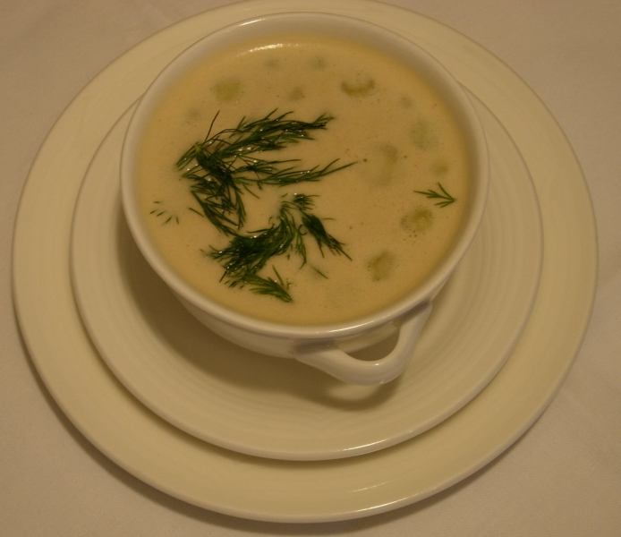 - Direct voor het uitserveren. Verdeel de garnalen en komkommer over de voorverwarmde borden. Schep de soep op de garnaaltjes en de komkommer. Garneer met een takje dille.