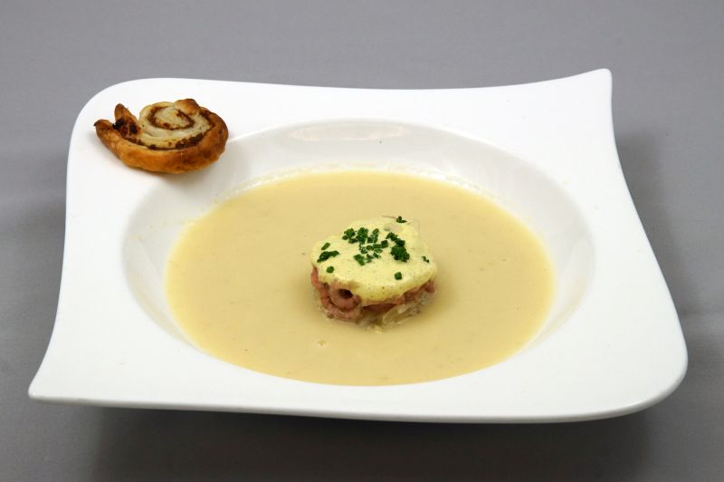 Soepje met zuurkool, knolselderij, kerrie, garnalen en een ansjoviskoekje