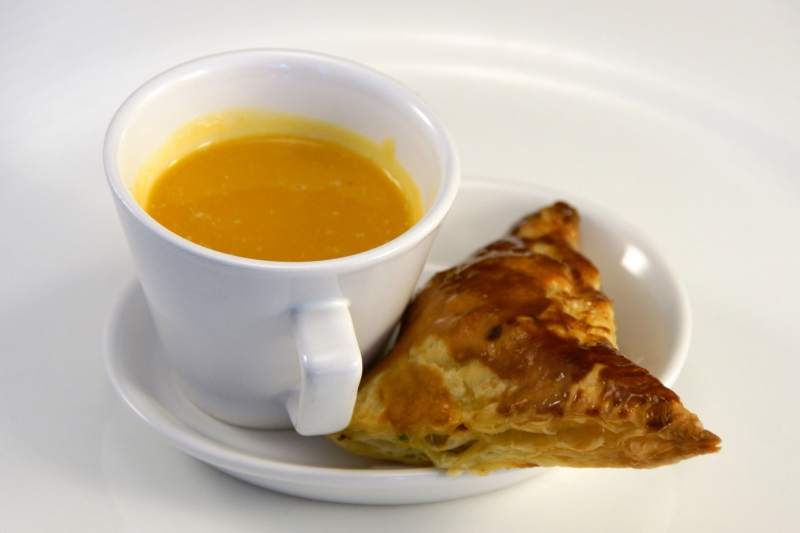 - Schep de soep in een amusekopje en leg er een pasteitje naast.