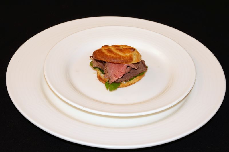 - Snijd vlak voor gebruik met behulp van de snijmachine (stand2) de rosbief in dunne plakjes.