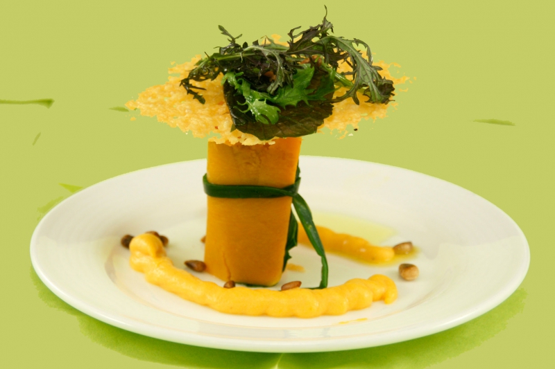 - Zet op een rond bord in het midden een pompoenrolletje.