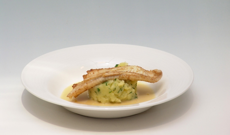 - Bak de met peper en zout gekruide tarbotmoten in een beetje boter in een anti aanbakpan aan één kant. Leg ze op een plateau.