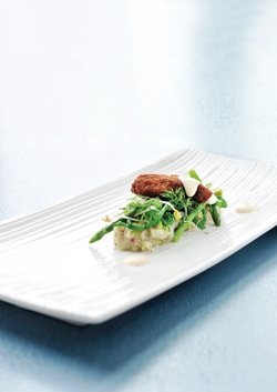 - Besprenkel de zeekraal en de aspergepunten met wat olijfolie en citroensap en leg wat zeekraal en 2 aspergepunten op de zeebaarstartaar.