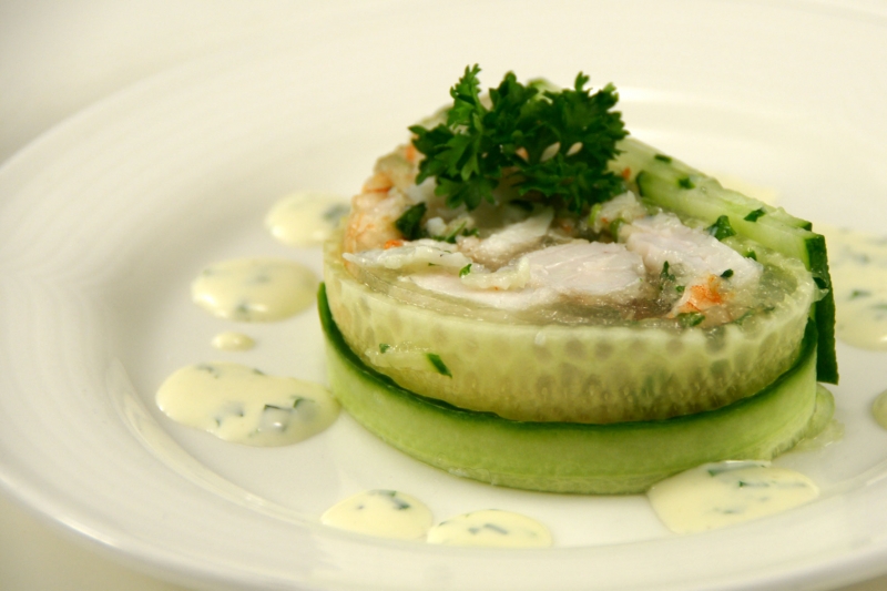 - Leg een dun laagje gelei op de komkommer, daarop een laagje snoekbaars, daarna een laagje gelei en het garnalenmengsel. Zo bouw je de terrine op.