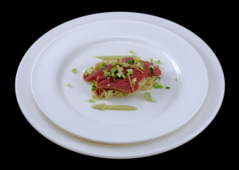 Teryaki van struisvogel met japanse noedels en avocadowasabi-mayonaise