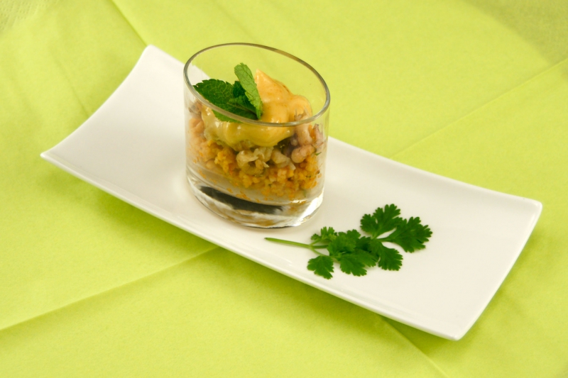 - Vul 14 glaasjes met de couscoussalade en leg hierop de Hollandse garnaaltjes.