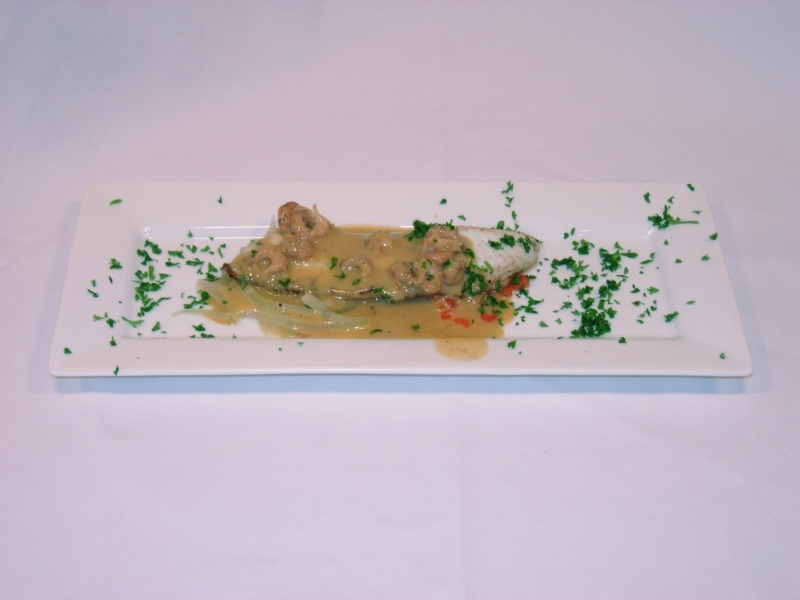 - Saus: De Noilly Prat, visbouillon, sjalot, en de gekneusde peperkorrels tot 1/3 inkoken.