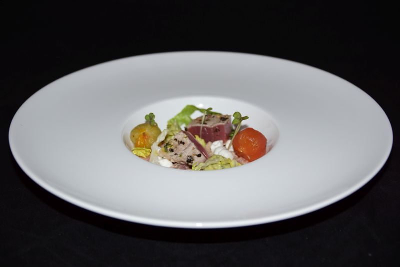 - Verdeeel de geitenkaasbolletjes over de crème en zet de blokjes tonijn erop.