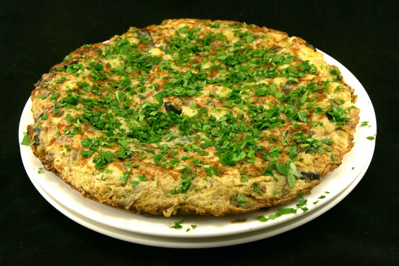 - Klop de eieren los, vermeng met het aubergine-ui-aardappelmengsel en de ham en breng het geheel op smaak met zout en peper.