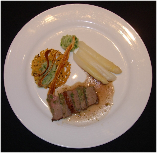 - Spuit de puree op de warme borden en leg hier de, eventueel bijgesneden, asperges tegenaan. Leg de lam tournedos op de puree.