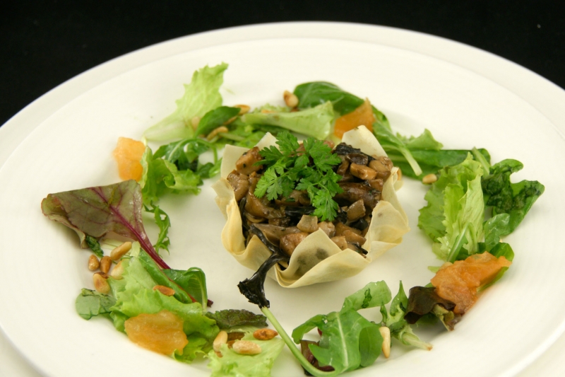 - Verhit boter in een koekenpan, voeg de trompettes des morts toe, wat zout en zwarte peper, doe een deksel op de pan en laat op laag vuur rustig garen. Breng over in een mengkom. Bak de oesterzwammen in boter, voeg zout en witte peper toe, doe het deksel kort op de pan en bak ze tenslotte met hoog vuur lichtbruin. Bak de kastanjechampignons in boter, voeg zout en zwarte peper toe, doe het deksel kort op de pan en bak vervolgens tot alle vocht is verdampt. Bak de shiitake in boter, voeg zout en zwarte peper toe. Als de shiitake bijna goed gebakken is, de knoflook even meefruiten. Bak de cantharellen tegelijkertijd met het eekhoorntjesbrood, voeg zout en zwarte peper toe. Fruit tenslotte de sjalot in boter. Meng alles goed in de mengkom.