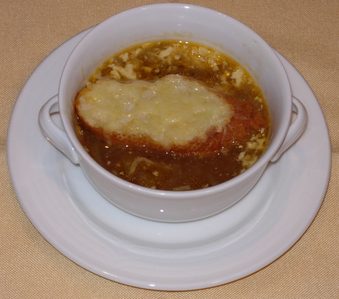 - Schik een sneetje stokbrood op de soep en strooi er een handvol geraspte Gruyère over. Zet onder een hete salamander tot de kaas begint te borrelen en dien direct op.
